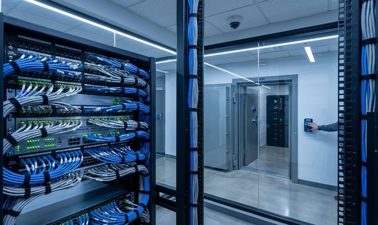 El Desafío: Oficina administrativa con "cableado" (desordenado), desconexiones constantes de la red LAN y falta de control sobre quién ingresaba al depósito.